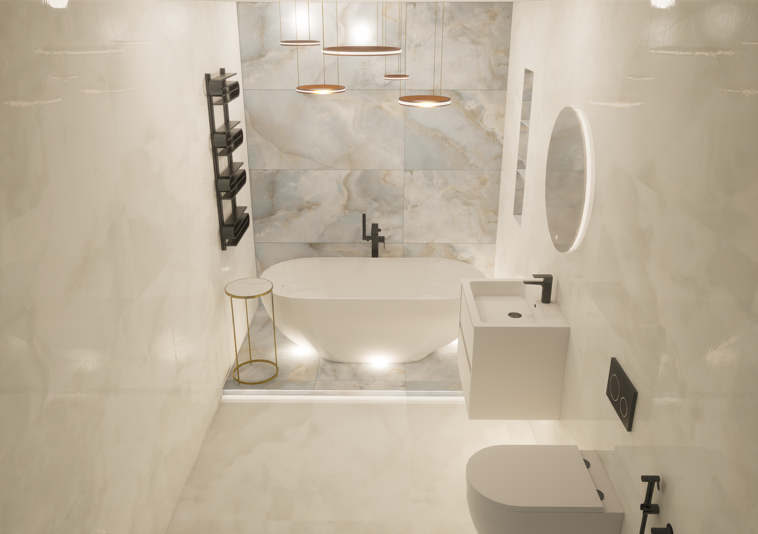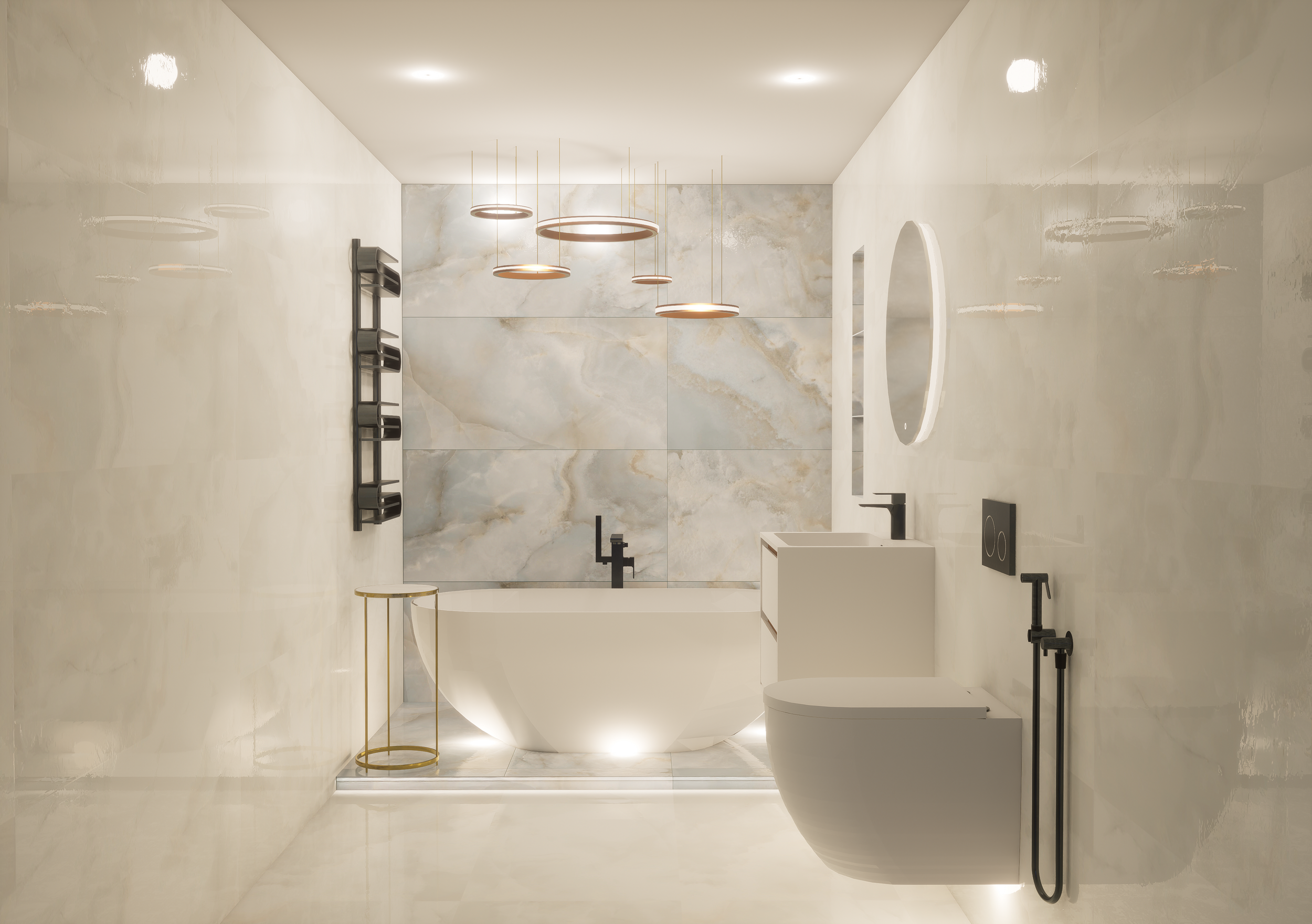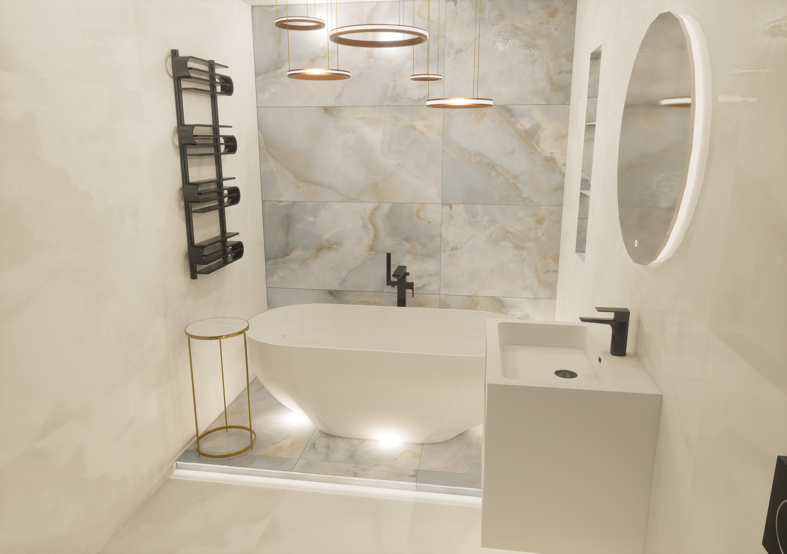 An atmospheric blend of soft ivory marble and stormy onyx veining, designed to evoke depth, drama, and elegance. The freestanding bath takes centre stage beneath a sculptural lighting arrangement — a statement of balance between warmth and luxury.