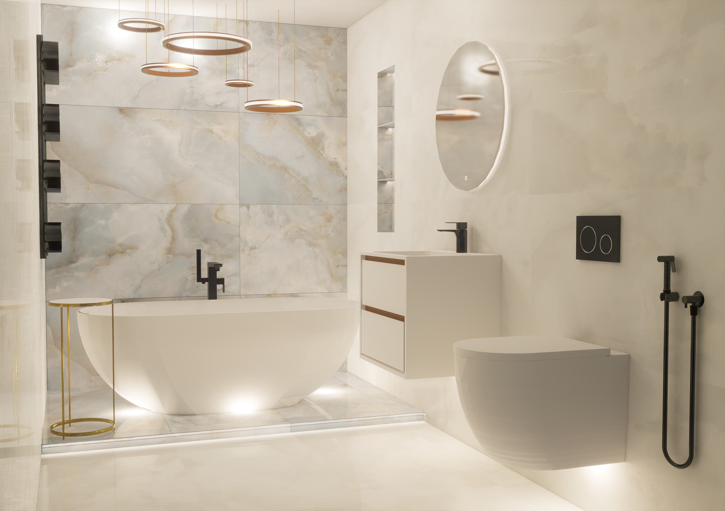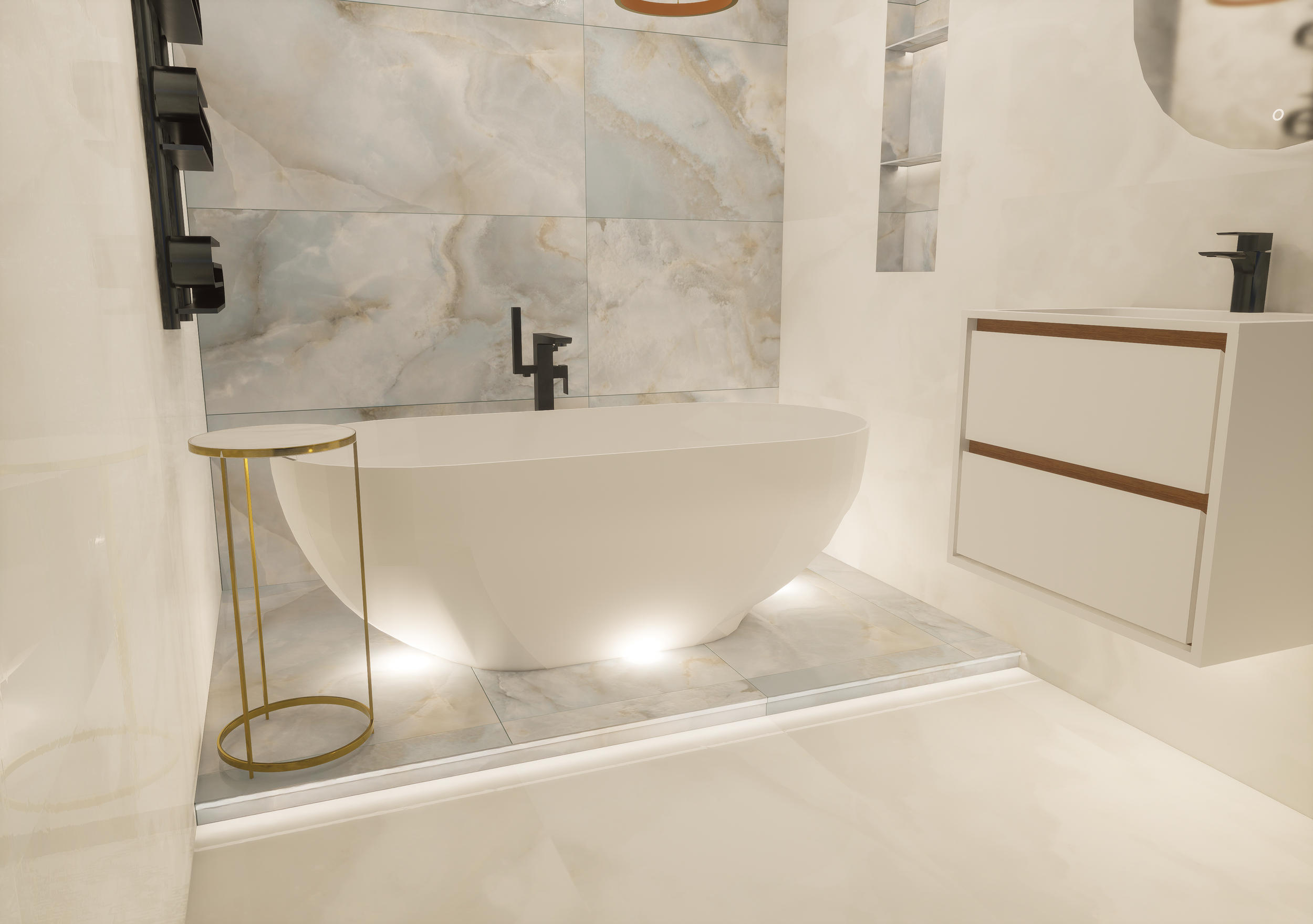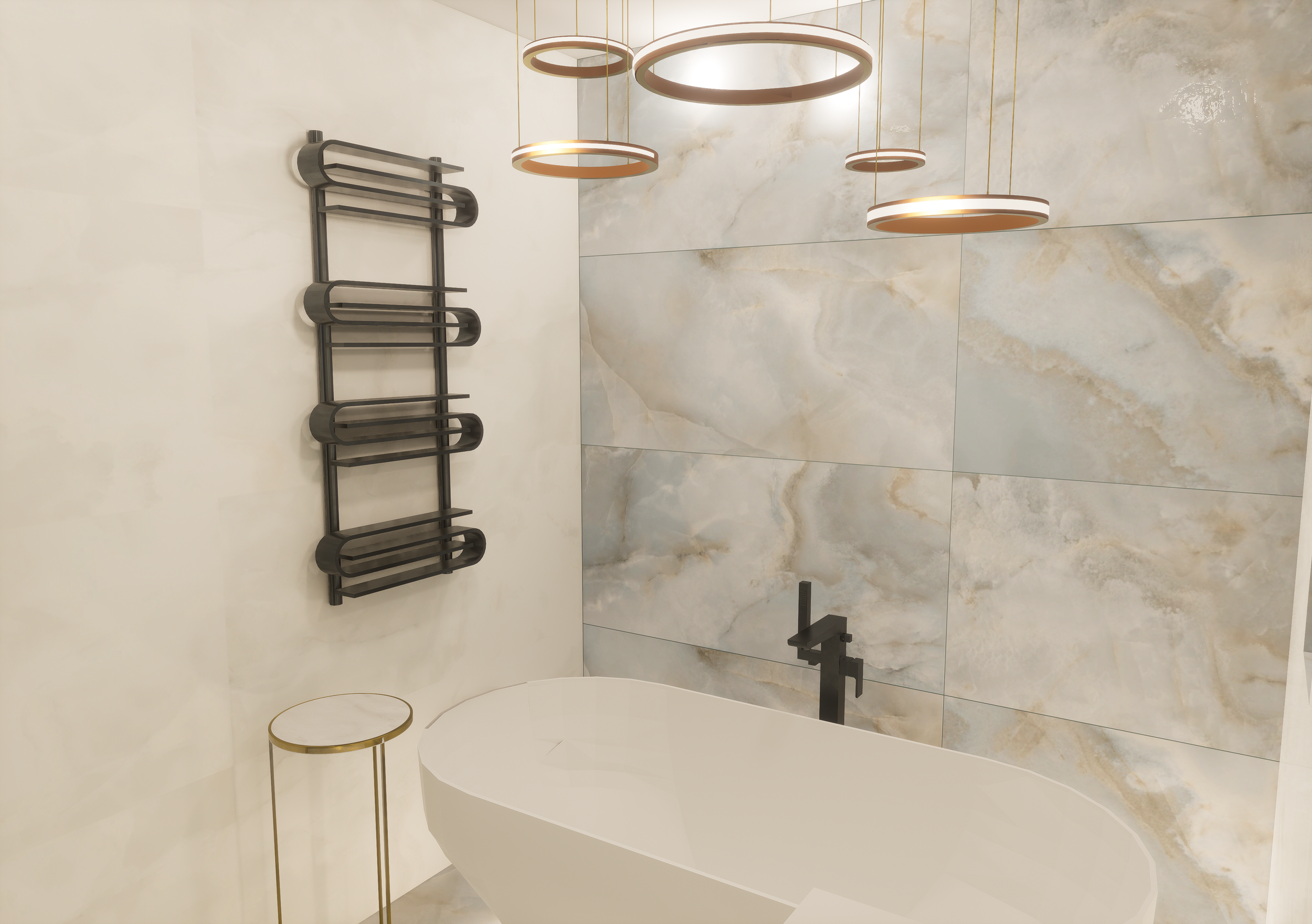 An atmospheric blend of soft ivory marble and stormy onyx veining, designed to evoke depth, drama, and elegance. The freestanding bath takes centre stage beneath a sculptural lighting arrangement — a statement of balance between warmth and luxury.