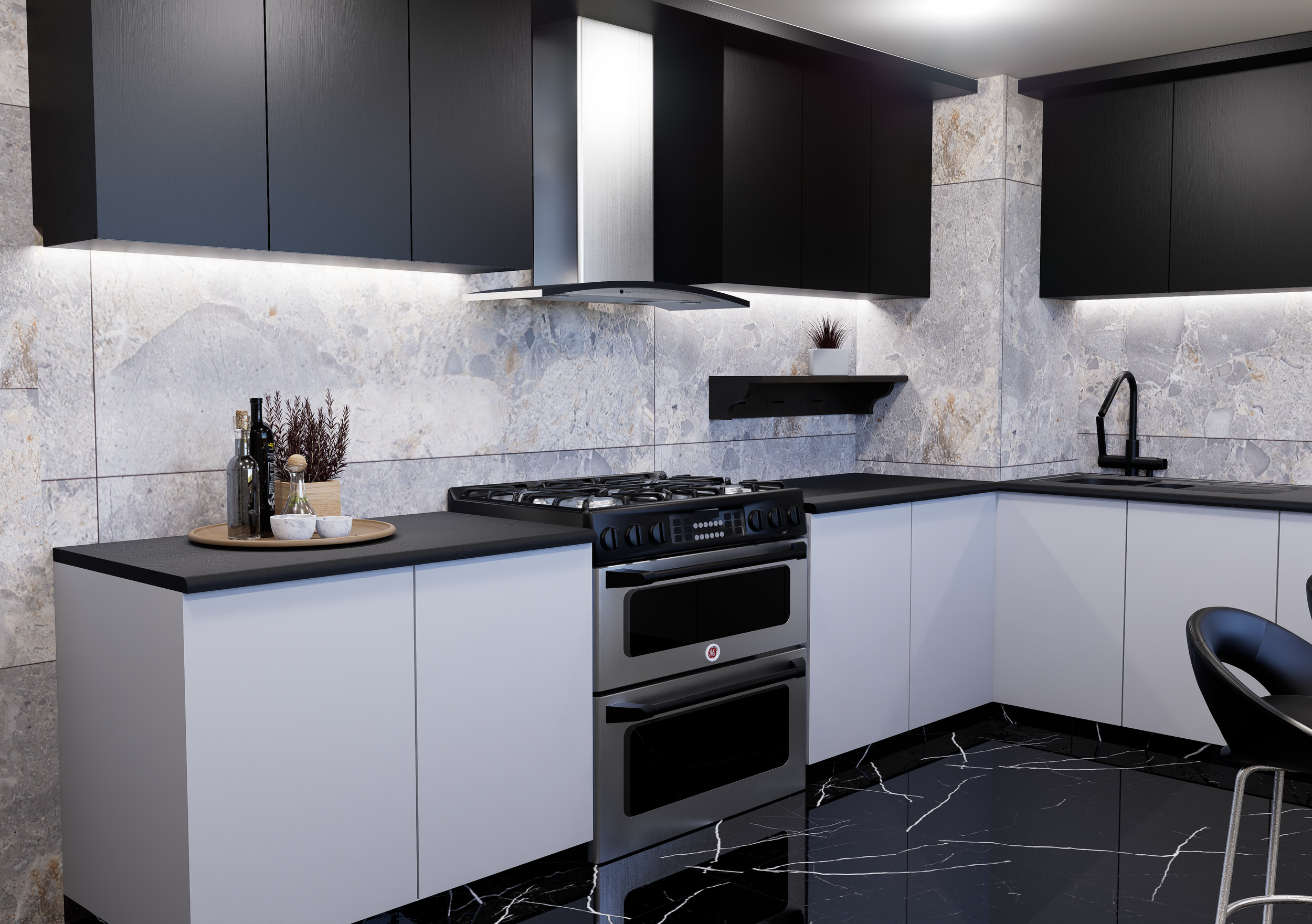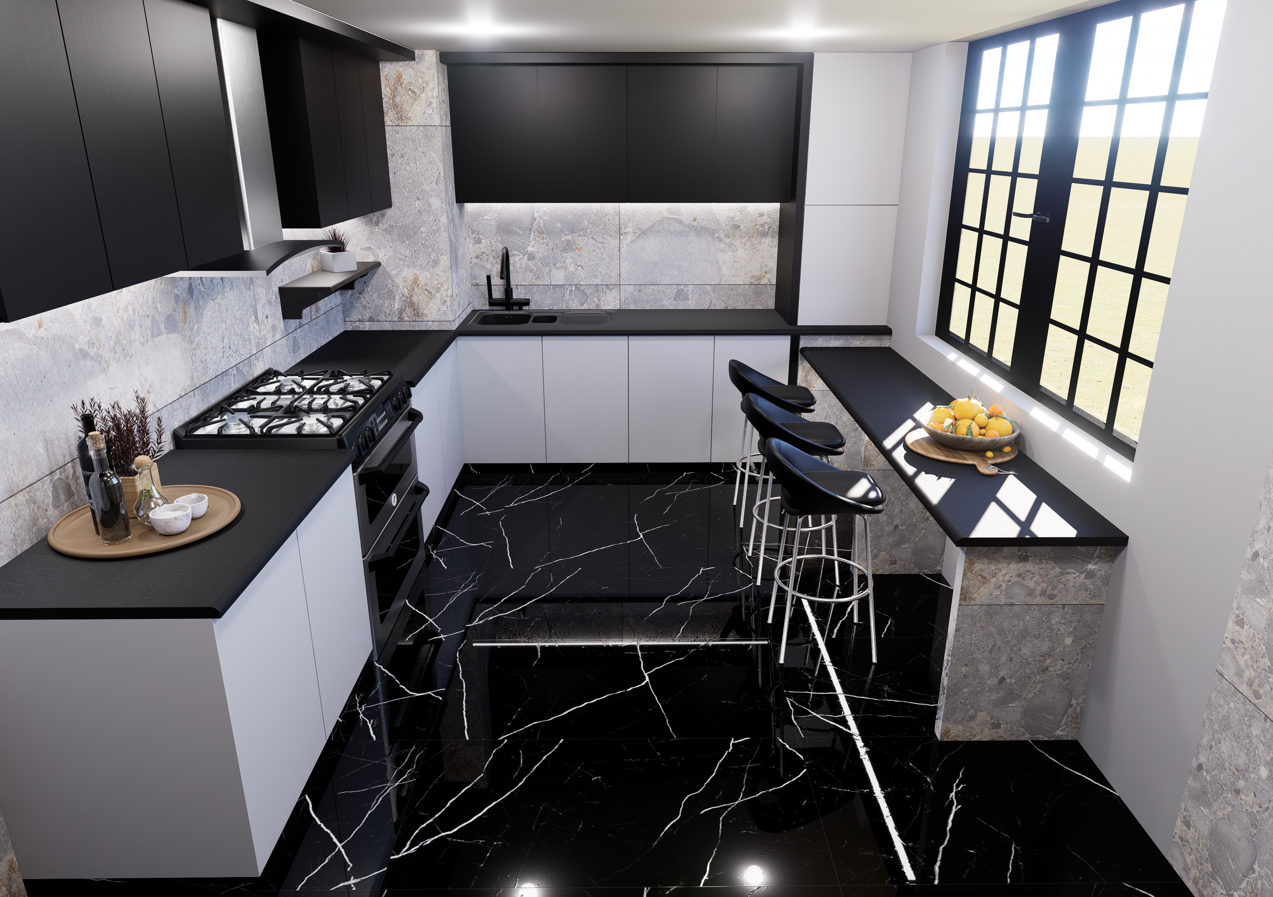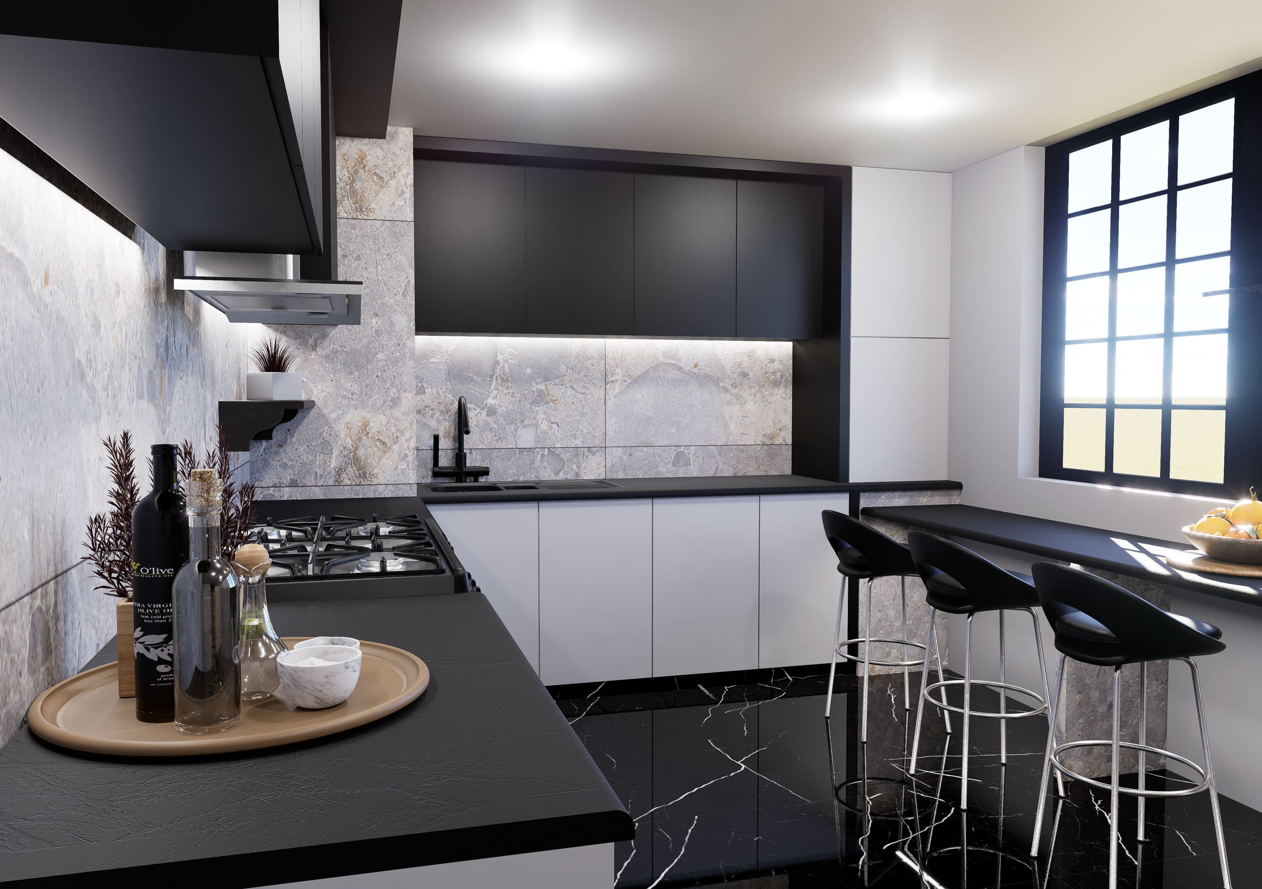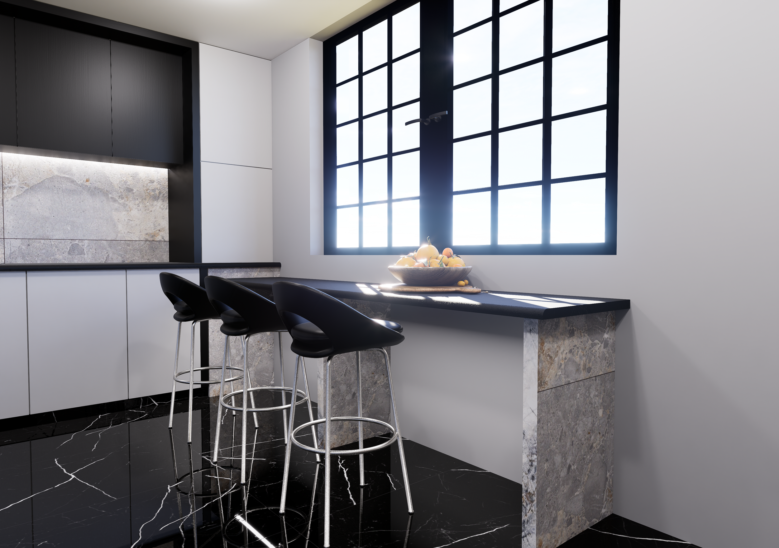 Monochrome Muse feels confident, composed, and modern. The space is dark yet bright, dramatic yet calm — the perfect balance between masculine edge and refined elegance. The mix of polished marble, matte cabinetry, and natural stone creates a luxurious atmosphere that feels both grounded and striking. It’s the type of kitchen that makes a statement without trying — a space built for someone who appreciates subtle details and bold design.