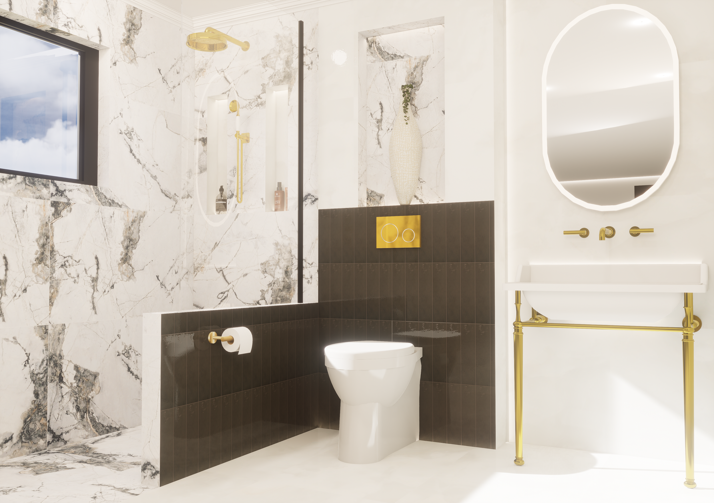 The Aurelia Bath pairs classic marble veining with sleek modern lines, celebrating contrast between bold black detail and soft ivory tones. Gold fixtures elevate the space, creating a sense of indulgence while maintaining serene balance.
