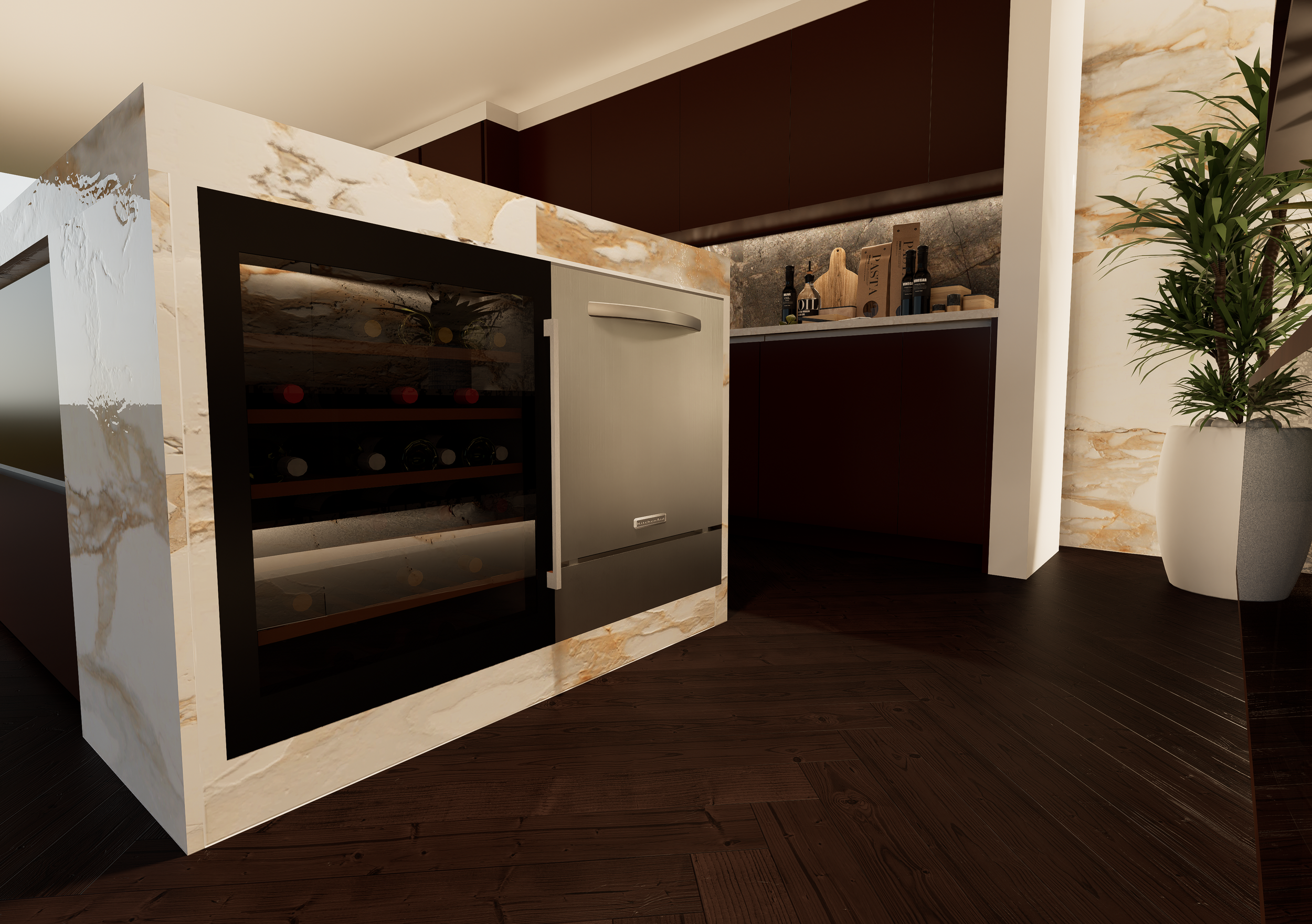 A bold composition of deep maroon cabinetry and cascading Calcutta Oro marble, designed to command presence while maintaining a refined balance of warmth and sophistication. The clean geometry of the island contrasts against the soft, organic veining — creating a kitchen that feels both powerful and elegant.