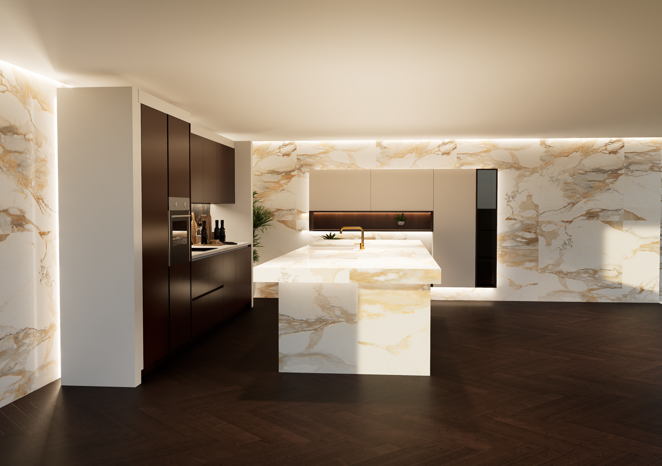Full-height marble splashback and waterfall island in Calacatta Oro